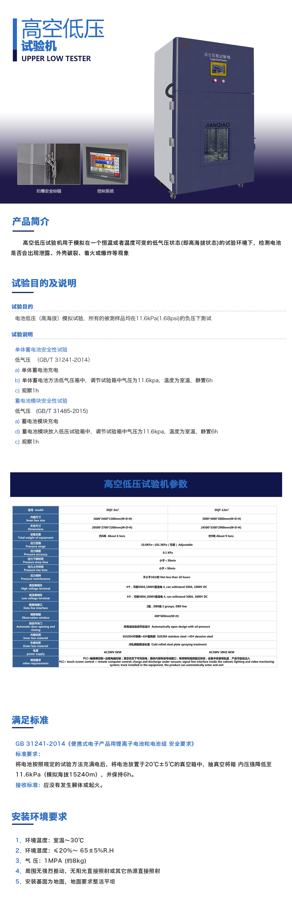 用途:高空低壓試驗機(jī)用于模擬在一個恒溫或者溫度可變的低氣壓狀態(tài)(即高海拔狀態(tài))的試驗環(huán)境下,檢測電池是否會出現(xiàn)泄露、外殼破裂、著火或爆炸等現(xiàn)象。