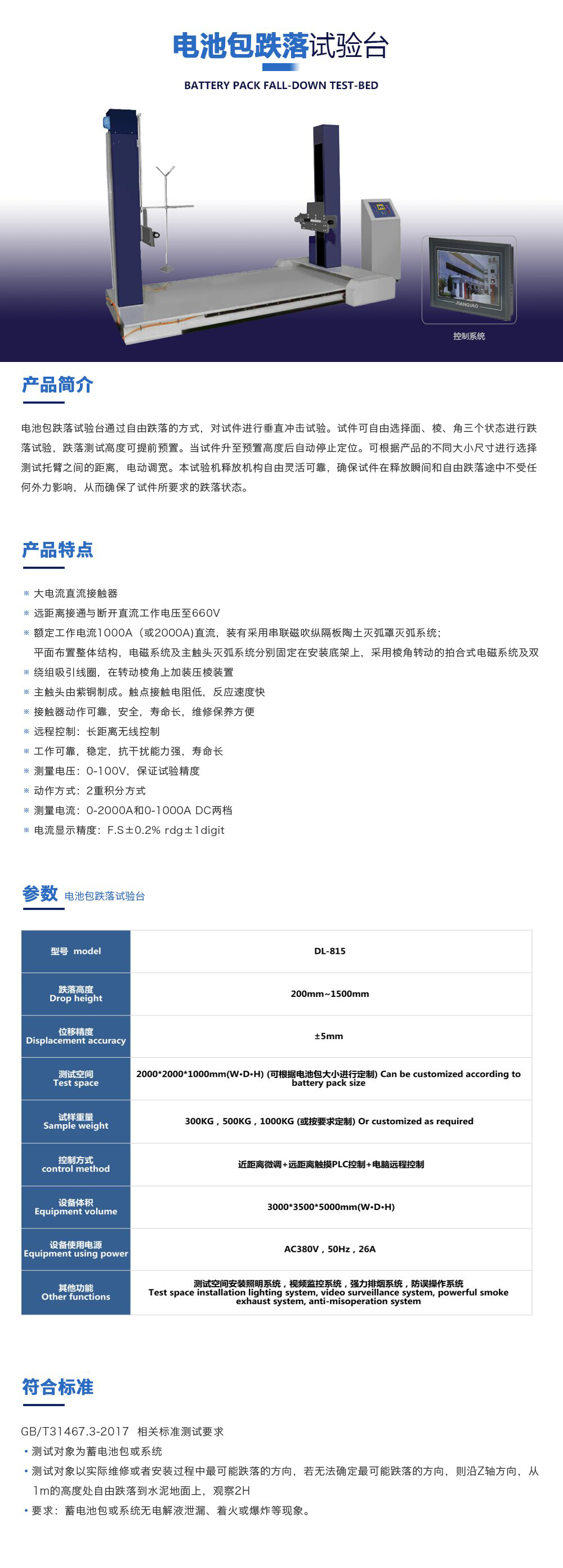 用途:電池包跌落試驗臺通過自由跌落的方式,對試件進行垂直沖擊試驗。試件可自由選擇面、棱、角三個狀態(tài)進行跌落試驗,跌落測試高度可提前預置。當試件升至預置高度后自動停止定位
