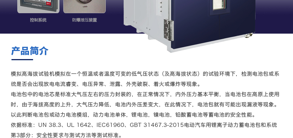 用途:模擬高海拔試驗機模擬在一個恒溫或者溫度可變的低氣壓狀態(及高海拔狀態)的試驗環境下,檢測電池包或系統是否會出現放電電流睿變、電壓異常、泄露、外殼破裂、著火或爆炸等