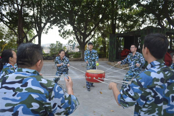 第三個(gè)項(xiàng)目:鼓動人心。一只大鼓周邊系滿了繩子,兩組隊(duì)員,每人一組十人合力拉緊繩子把鼓拉起,在鼓上放一只網(wǎng)球,利用鼓的彈性將網(wǎng)球彈起高于5cm的距離,一分鐘內(nèi)哪組彈起的次數(shù)多者獲勝。比賽時(shí)所有人員的都全神貫注于網(wǎng)球的起落和全力控制鼓的移動及上下,項(xiàng)目對于團(tuán)隊(duì)溝通協(xié)作起到了很好的啟示作用。