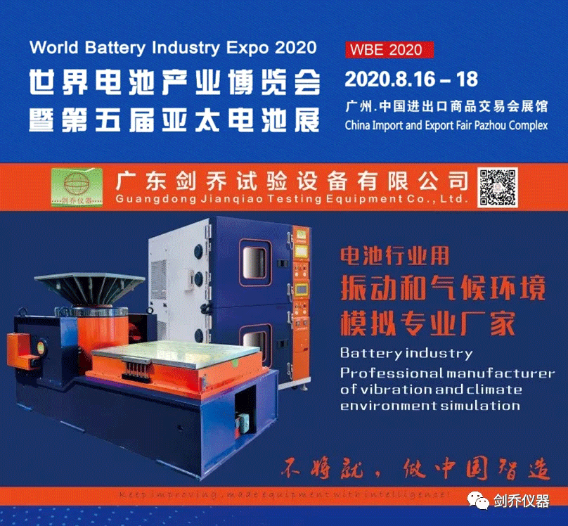 2020年8月16-18日,廣東劍喬試驗(yàn)設(shè)備有限公司【劍喬儀器】將攜旗下最新試驗(yàn)設(shè)備亮相2020世界電池產(chǎn)業(yè)博覽會暨第五屆亞太電池展,現(xiàn)場展示:振動試驗(yàn)系統(tǒng)、溫濕度振動三綜合箱、高加速沖擊試驗(yàn)臺、恒溫恒濕試驗(yàn)箱、冷熱沖擊試驗(yàn)箱等試驗(yàn)設(shè)備及鋰電池相關(guān)試驗(yàn)解決方案。