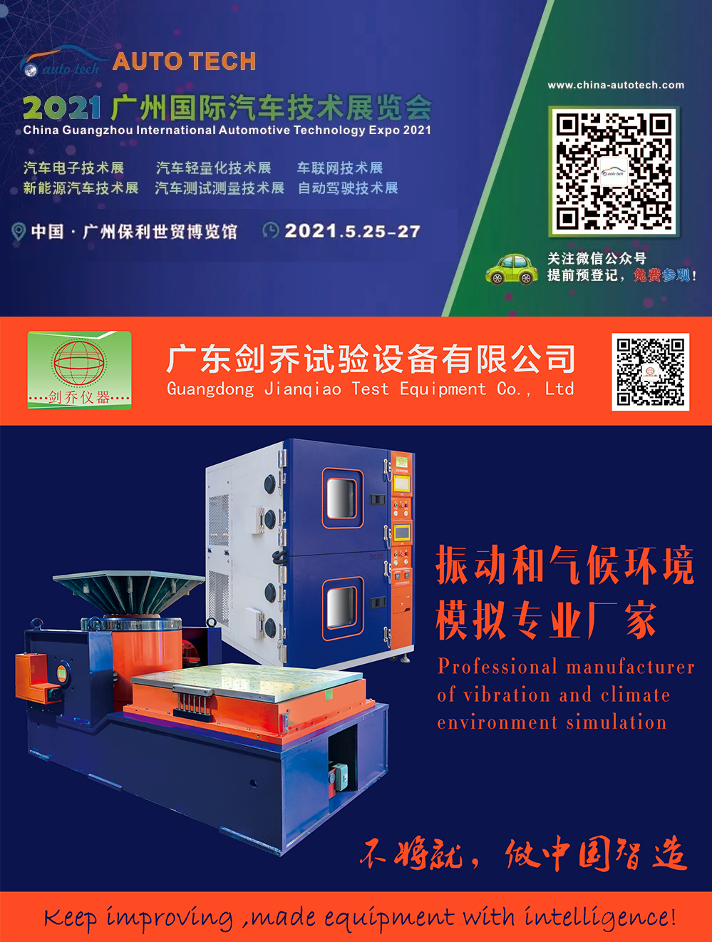 2021年5月25-27日,廣東劍喬試驗(yàn)設(shè)備有限公司【劍喬儀器】將攜旗下最新試驗(yàn)設(shè)備亮相AUTO TECH 2021 中國·廣州第八屆國際汽車技術(shù)展覽會,現(xiàn)場展示:振動試驗(yàn)系統(tǒng)、溫濕度振動三綜合箱、高低溫防爆試驗(yàn)箱高加速沖擊試驗(yàn)臺、電池?zé)釣E用試驗(yàn)機(jī)、電池短路試驗(yàn)箱、等試驗(yàn)設(shè)備及動力電池相關(guān)試驗(yàn)解決方案。